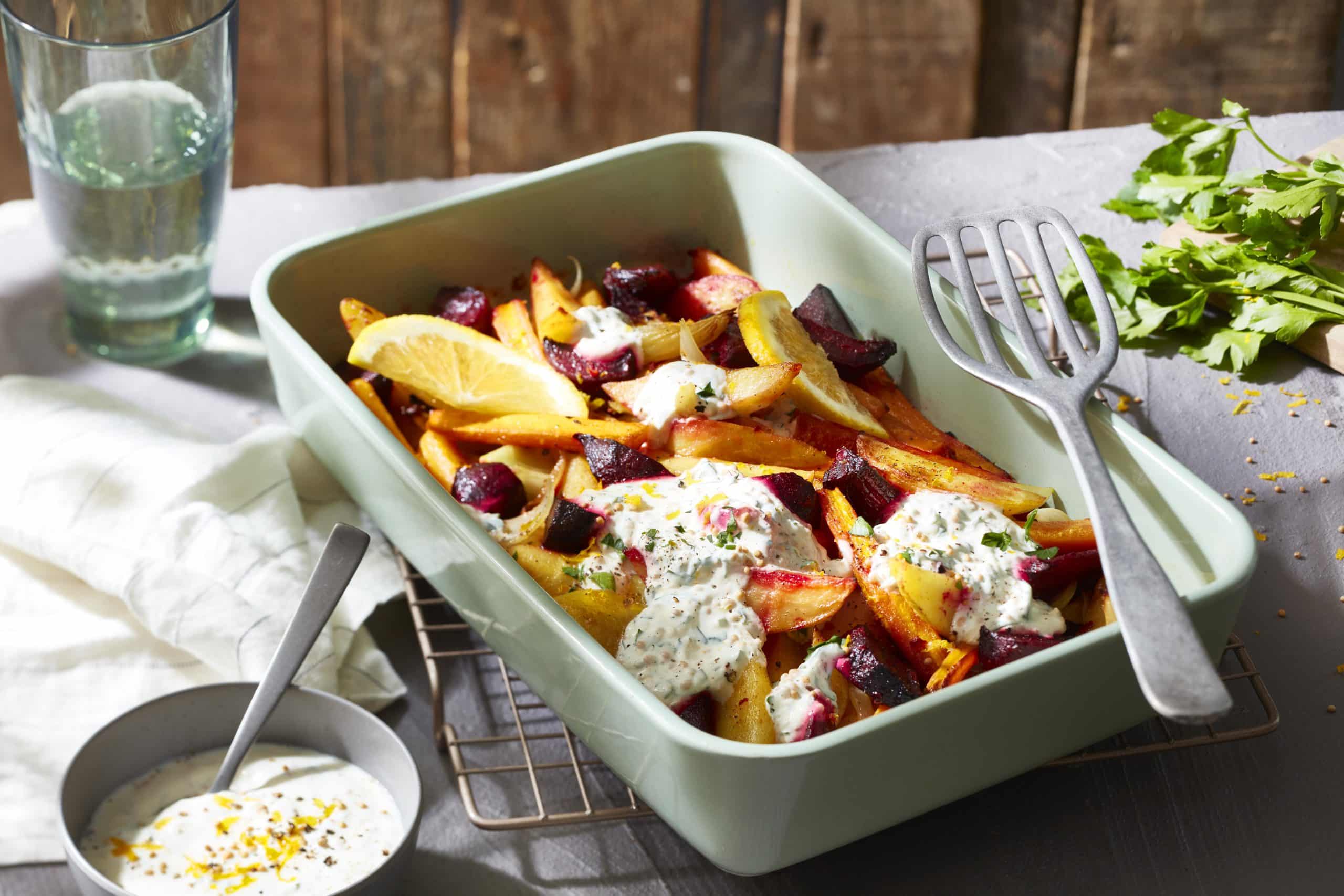 Gemeinsam im Ofen gegart, ergeben die aromatischen Knollen und Wurzeln ein kräftig-warmes Gericht, das nicht nur sättigt, sondern auch rundum guttut. Für eine Extraportion Frische sorgt ein Orangenjoghurt-Dip – reich an Vitamin C und Eiweiß.